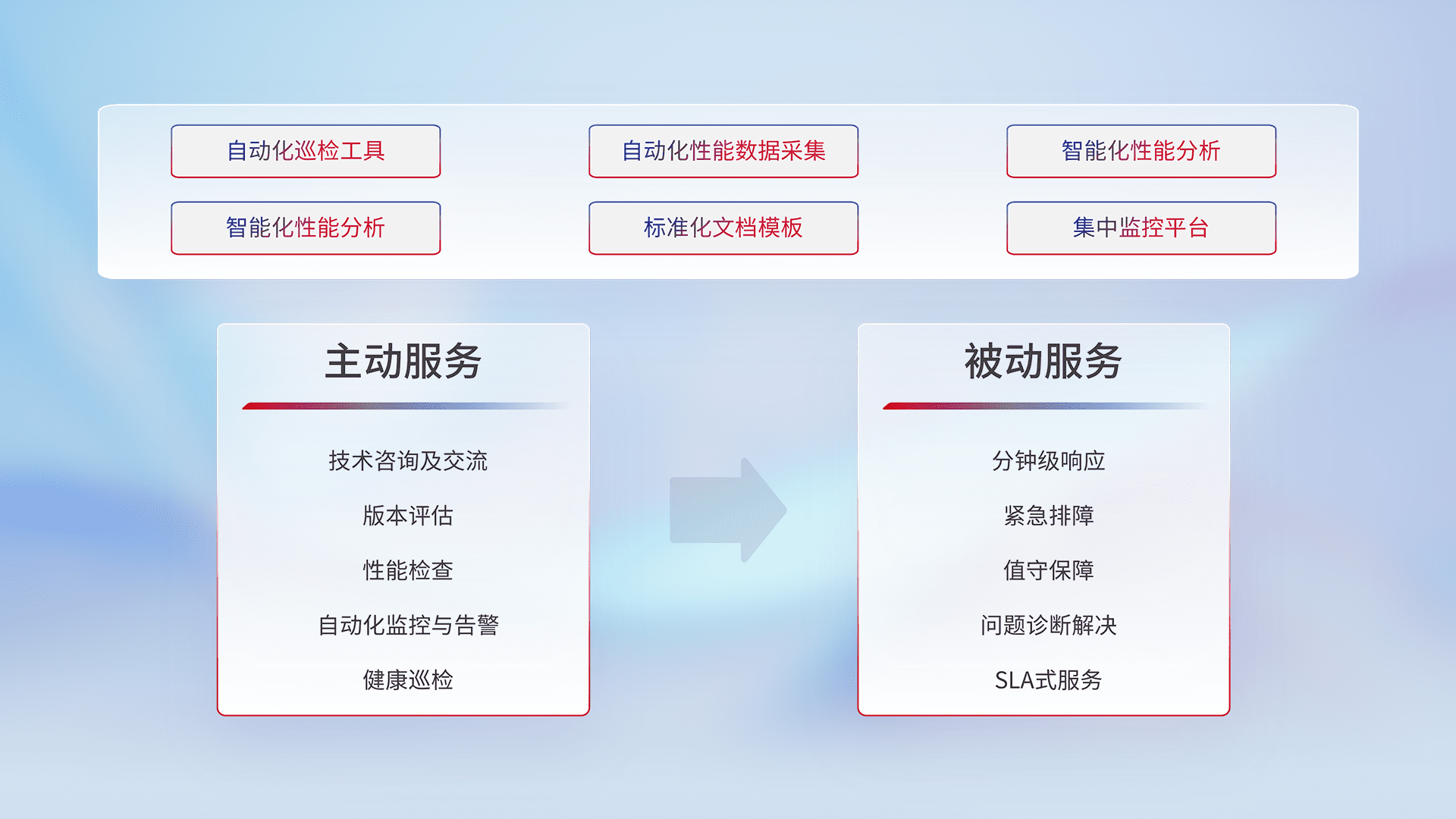 智能化工具和标准化文档,,,保障服务质量,,提供主动服务(包含技术咨询、、版本评估、、、性能检查、、自动化监控与告警、、、健康巡检)和被动服务包含(分钟级响应、、、紧急排障、、、值守保障、、、、问题诊断解决、、、、SLA服务)。。。。
